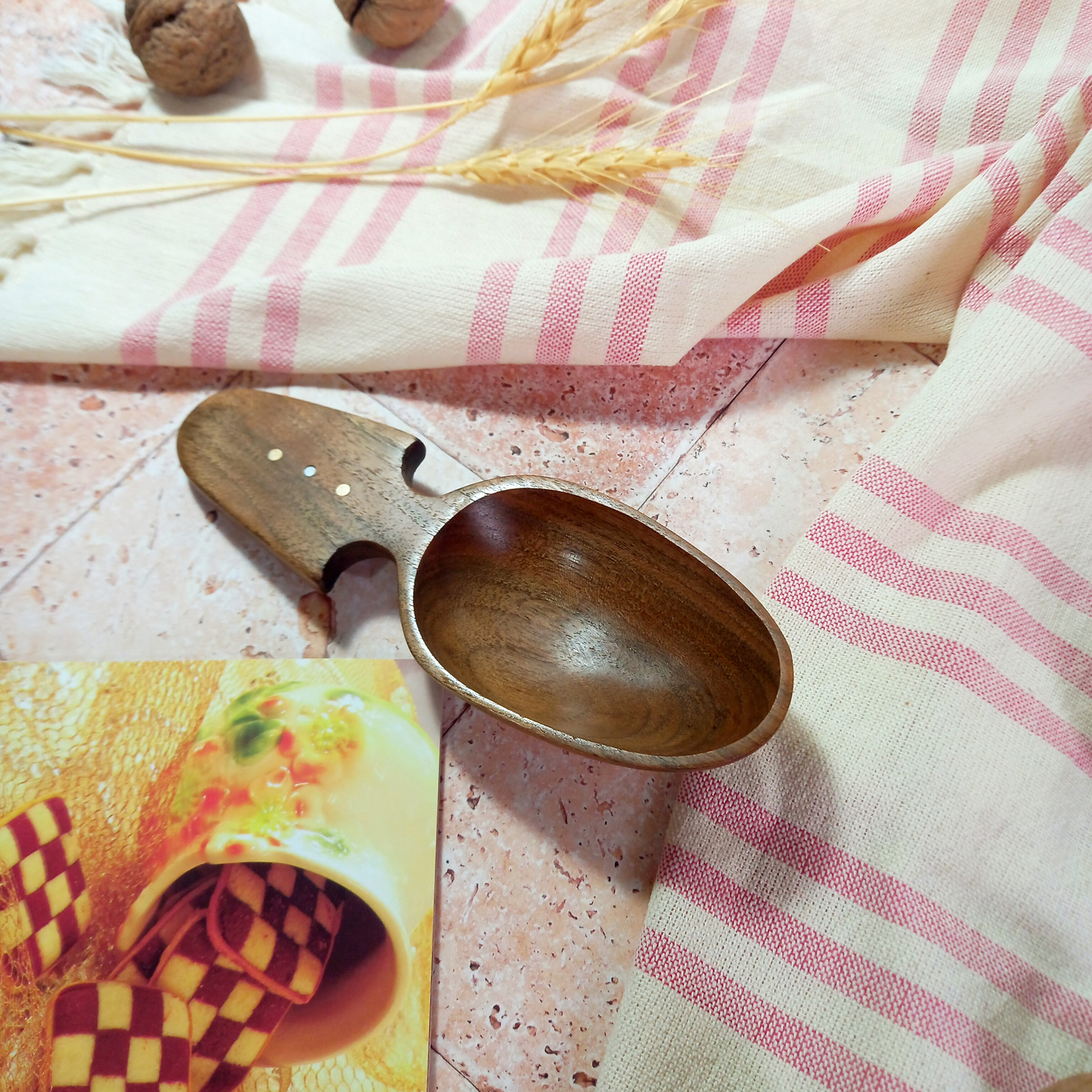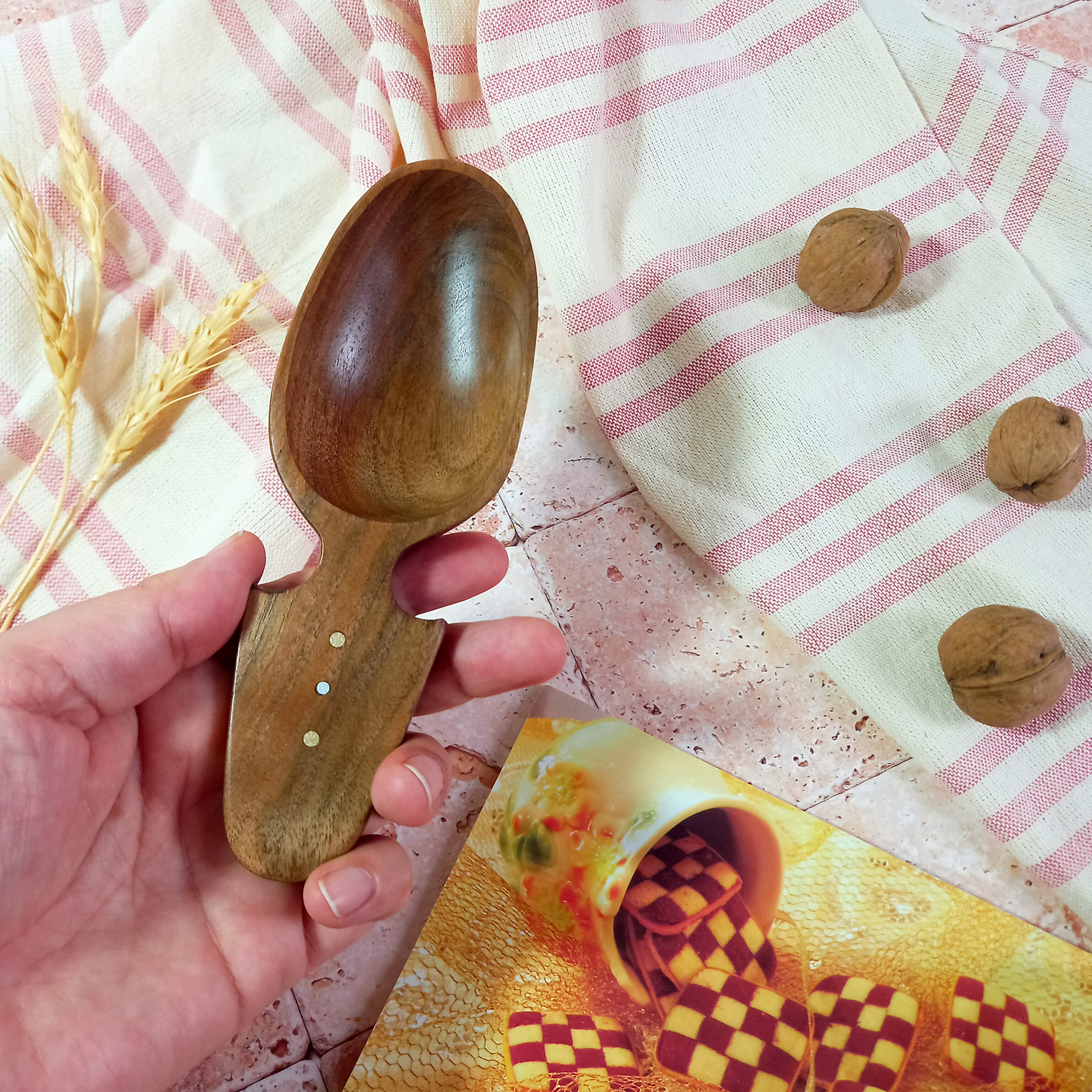 قاشق آجیل خوری چوبی دستساز برند بارلی چوب مدل آیلی برنج نشان 16 سانتی جنس چوب گردو
