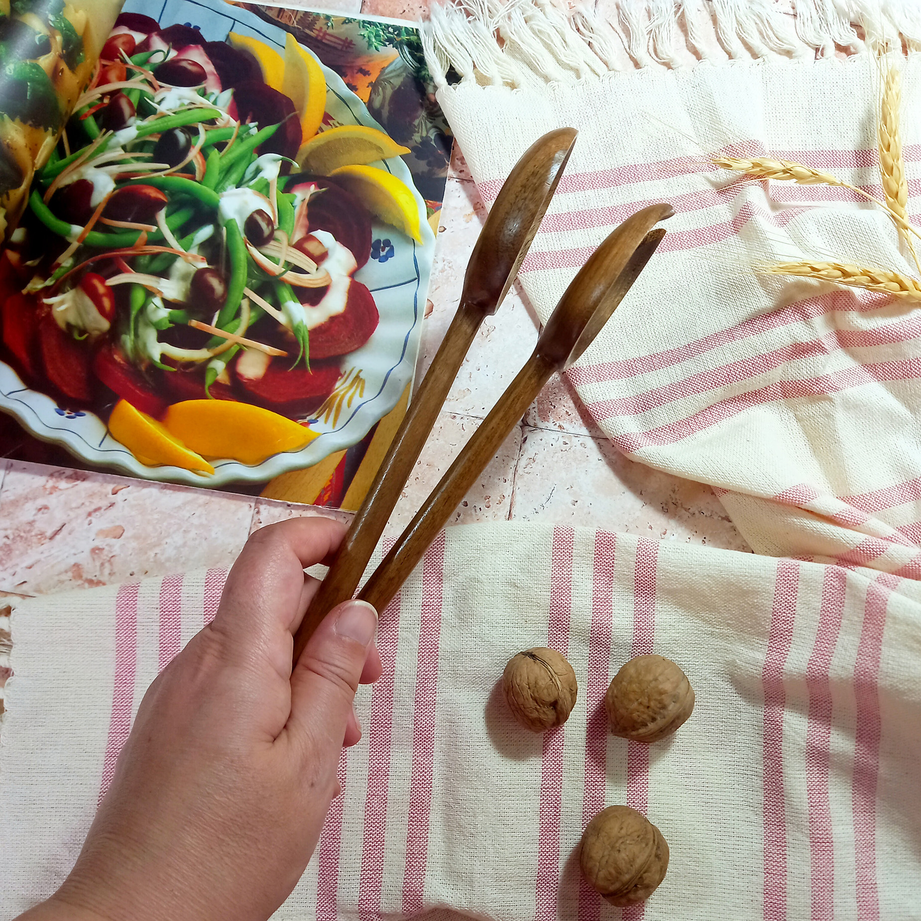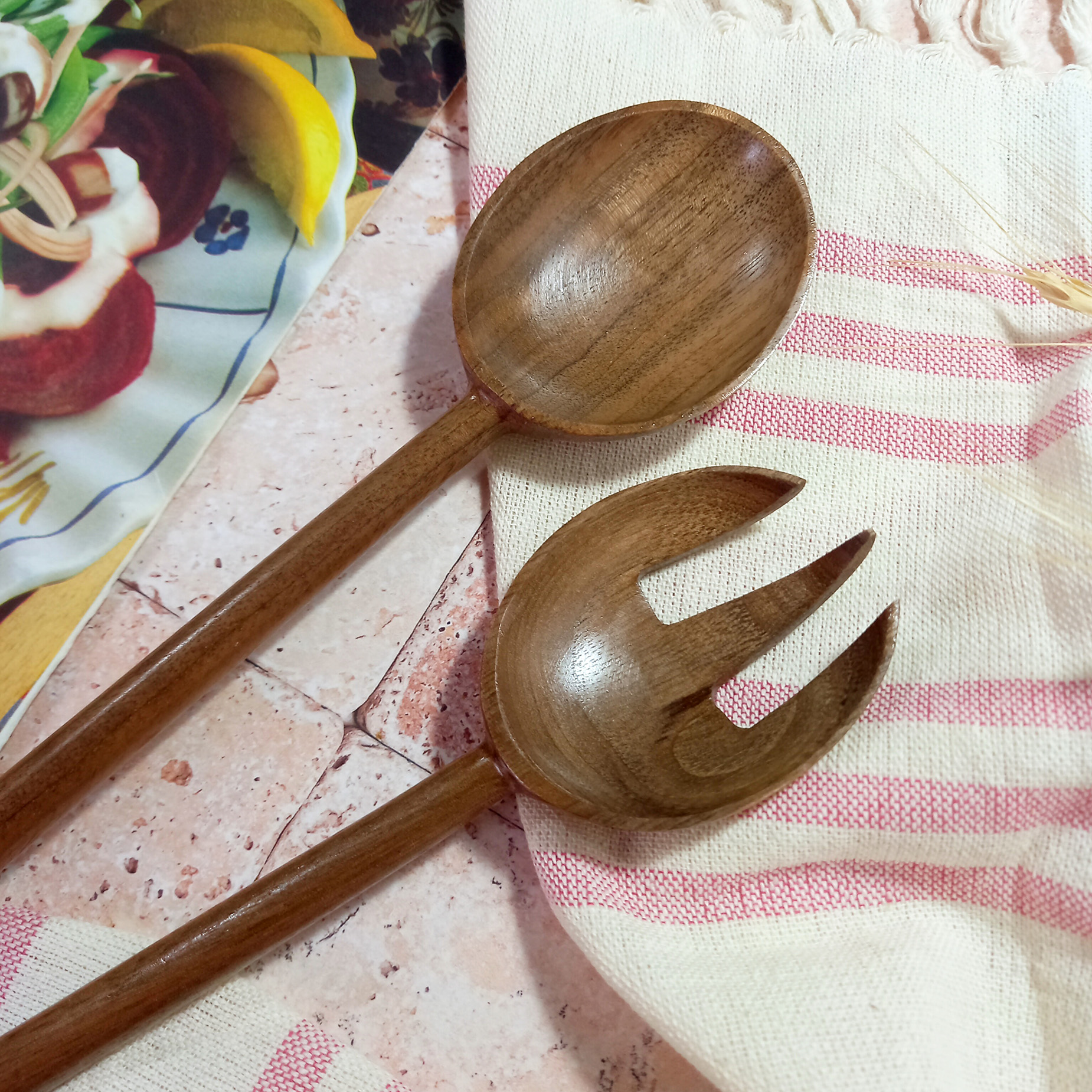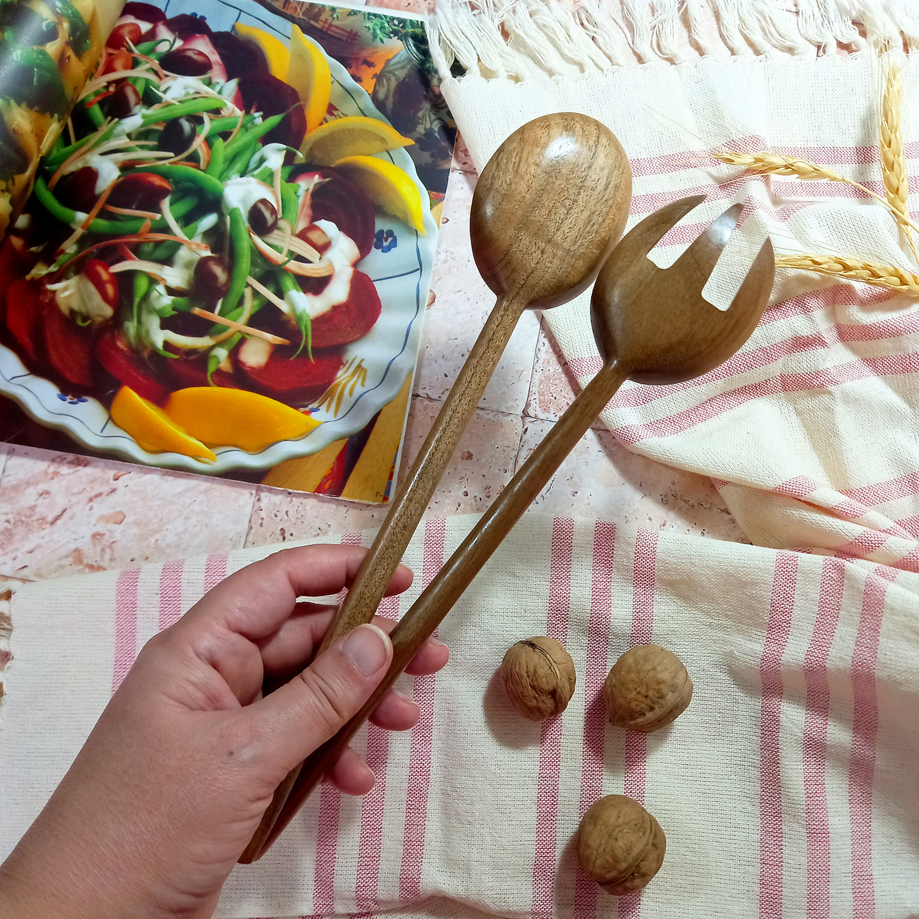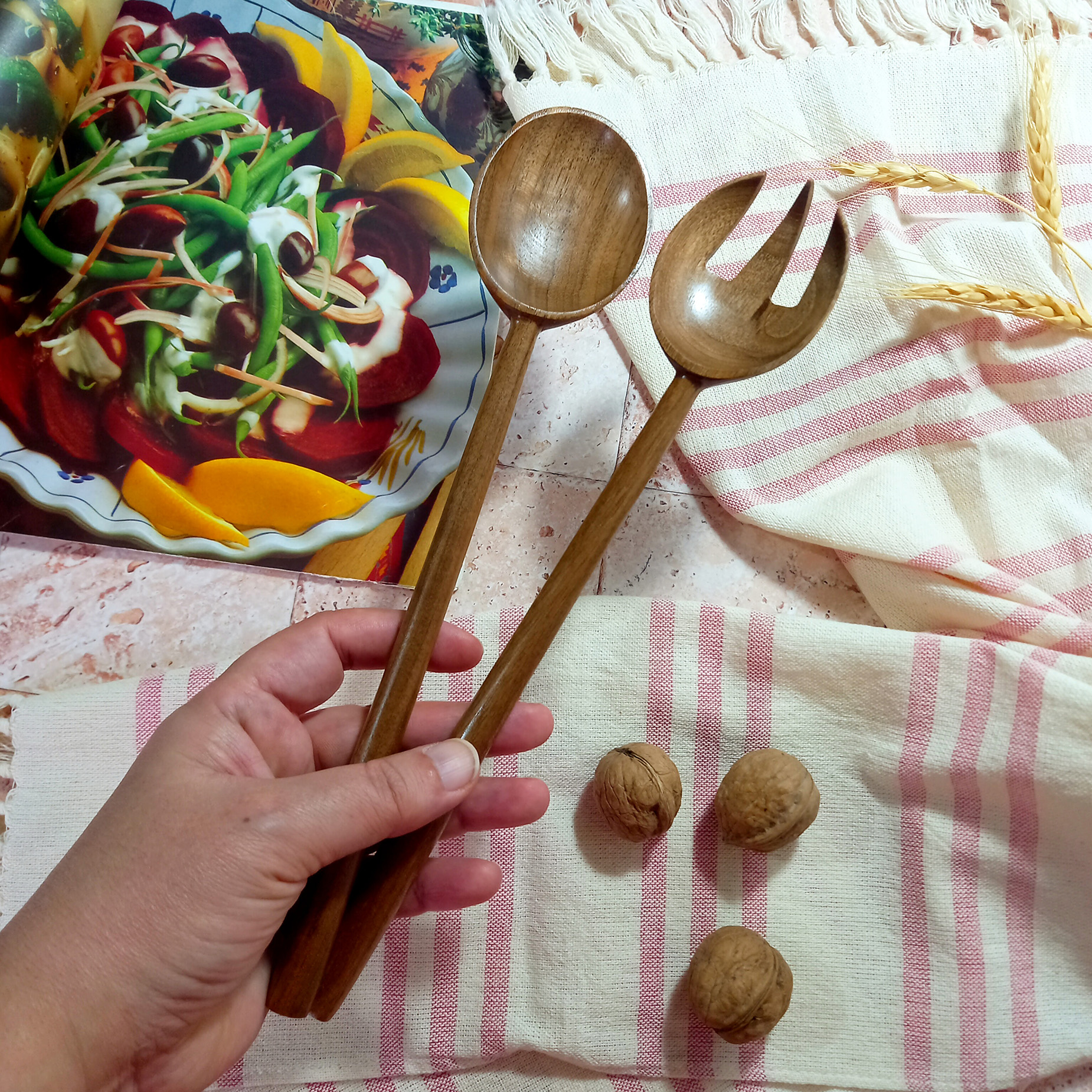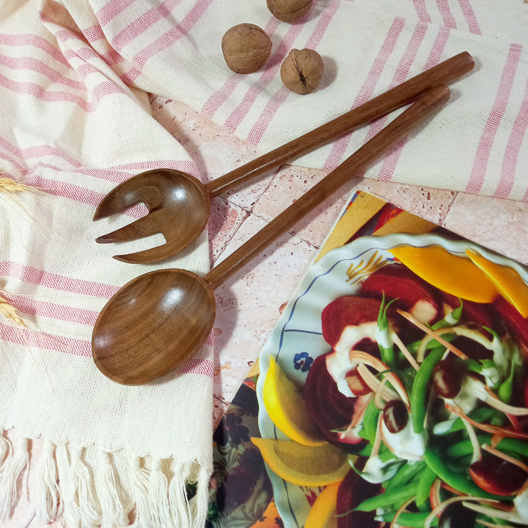 Handmade wooden salad fork and spoon set, Barley Wood brand, Thyme model, 27 cm, made of walnut wood
