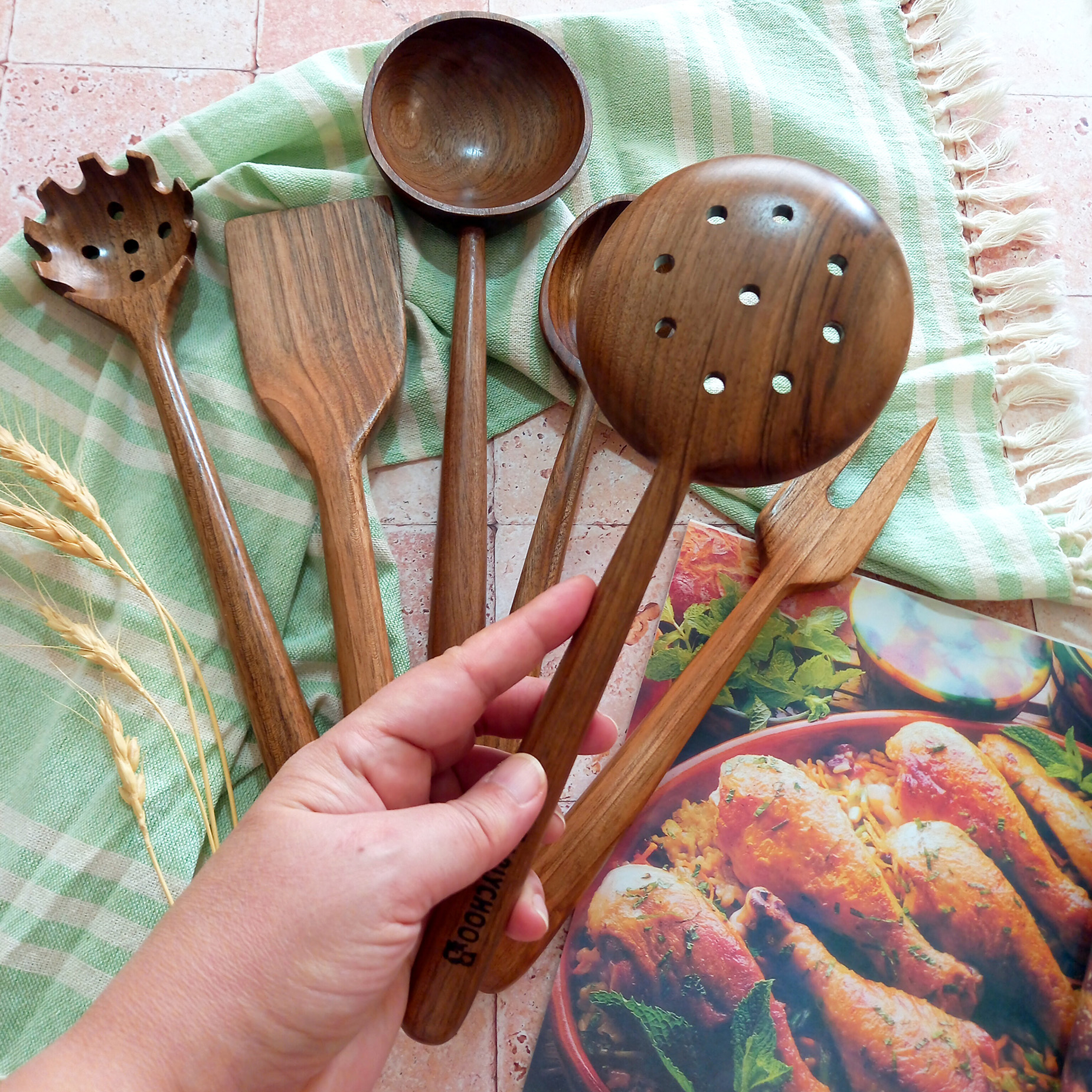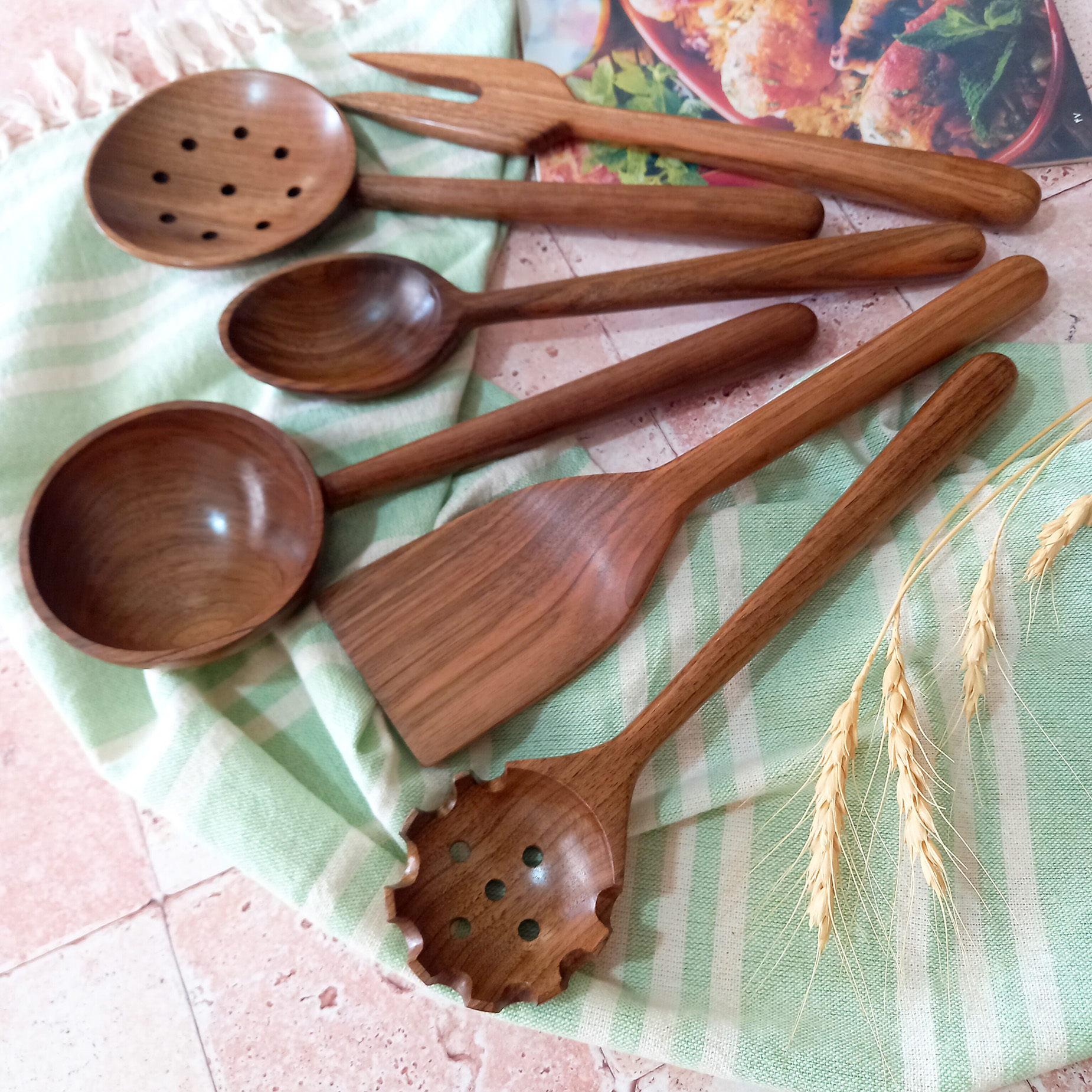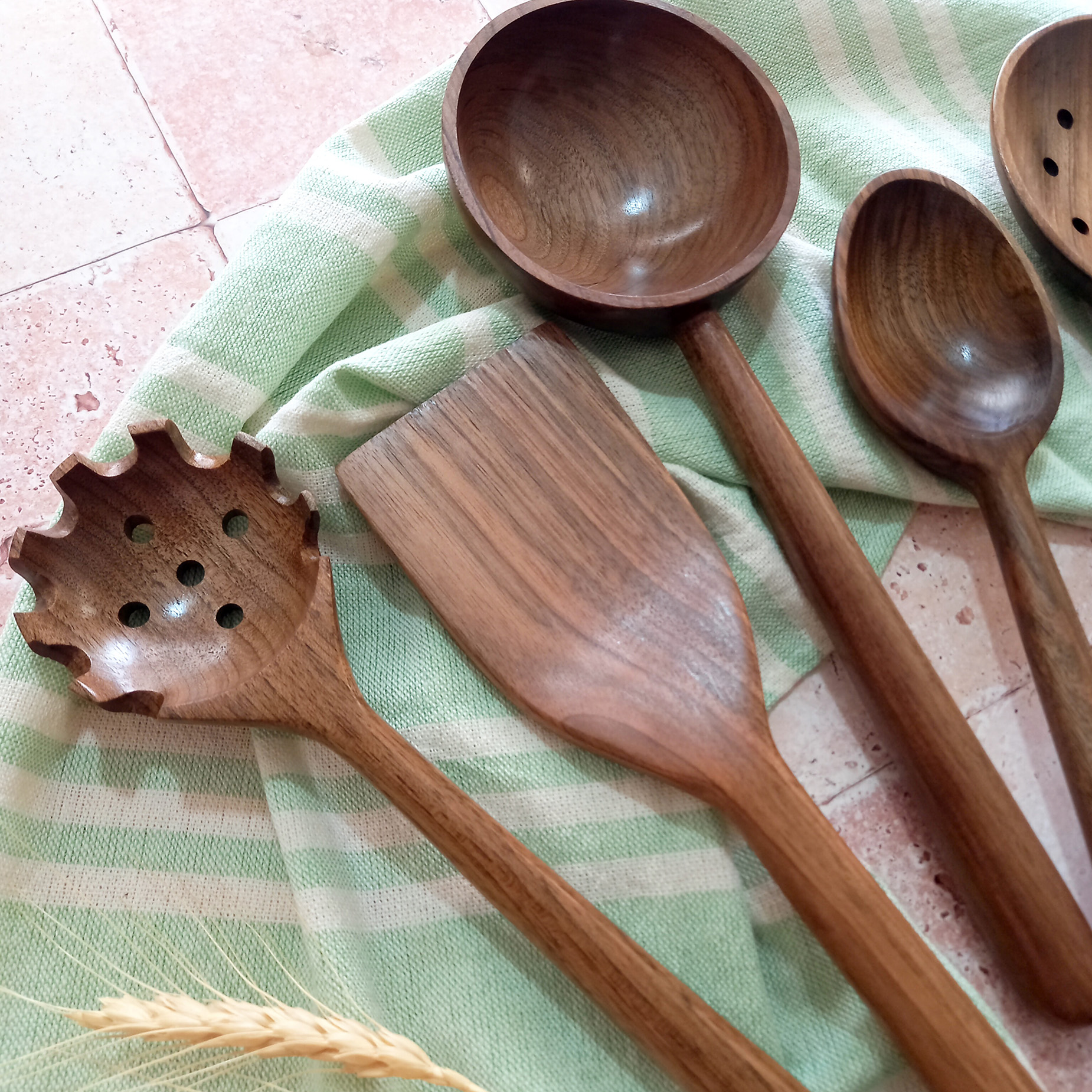 Handmade wooden spatula and ladle set, Barley Wood brand, Samin model, 6 pieces, walnut wood, 27 cm