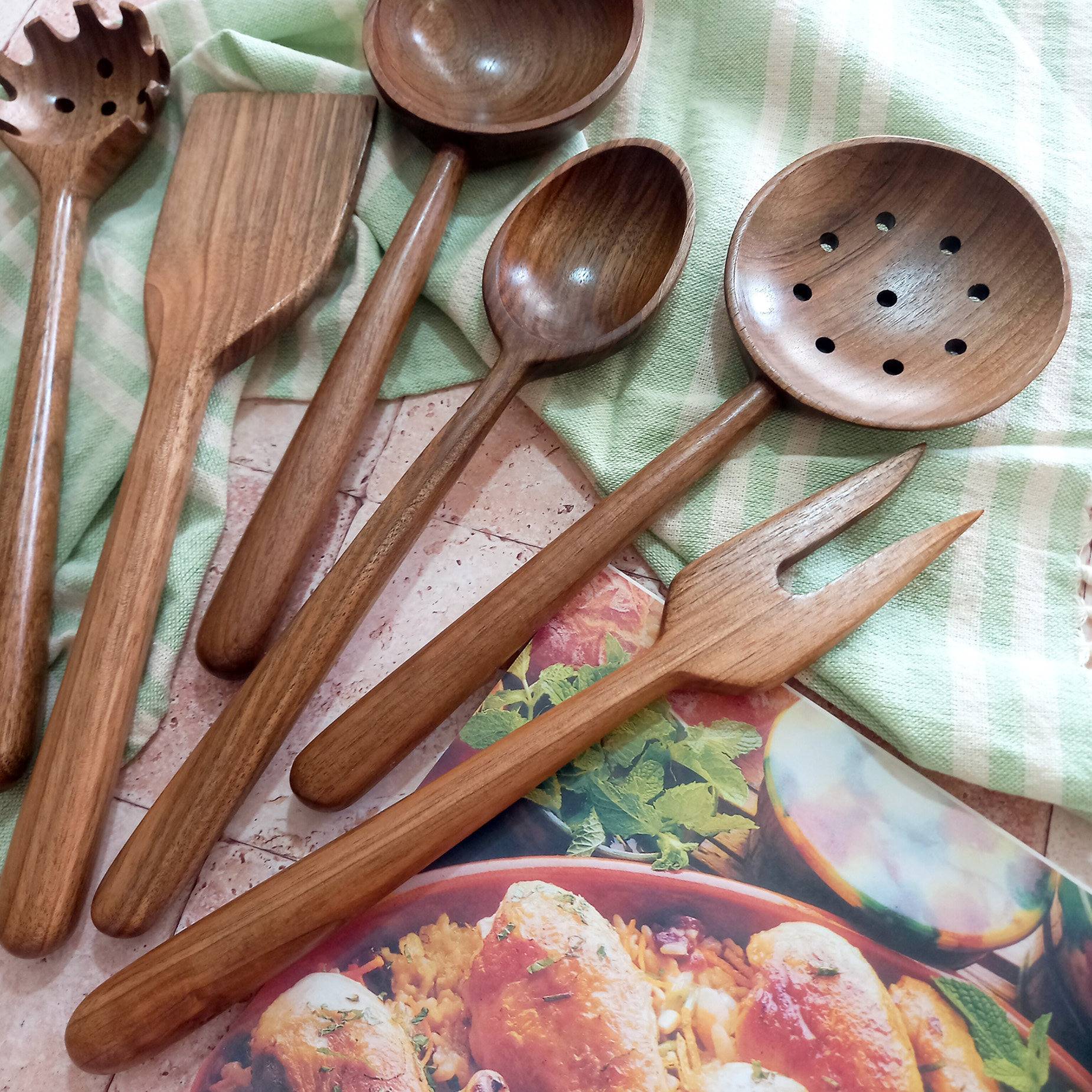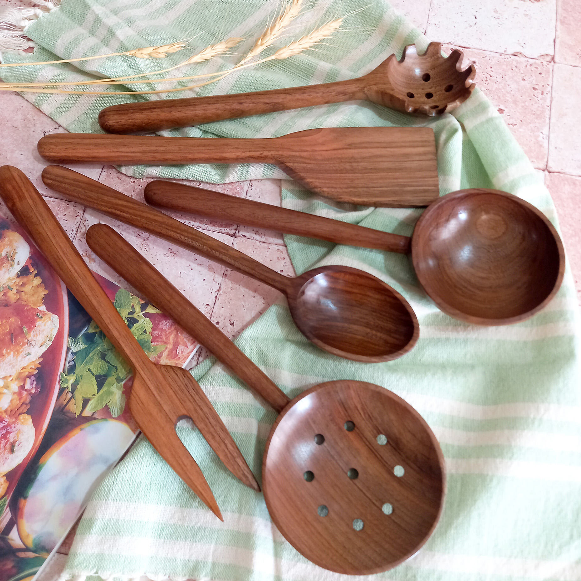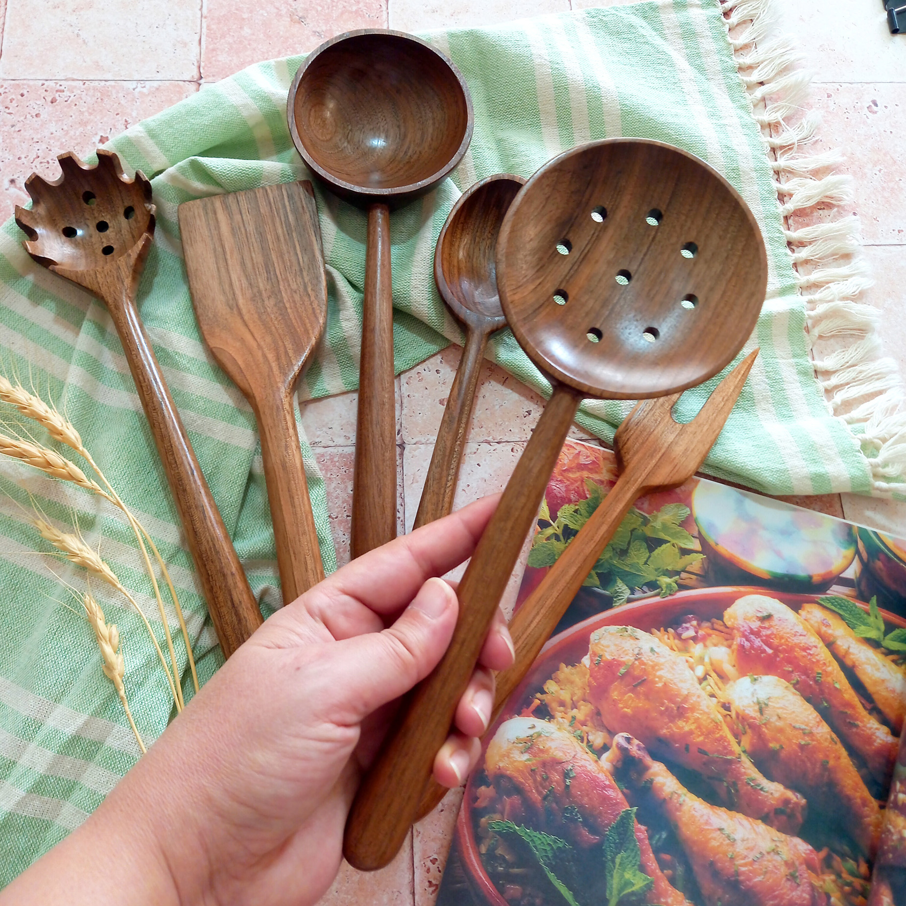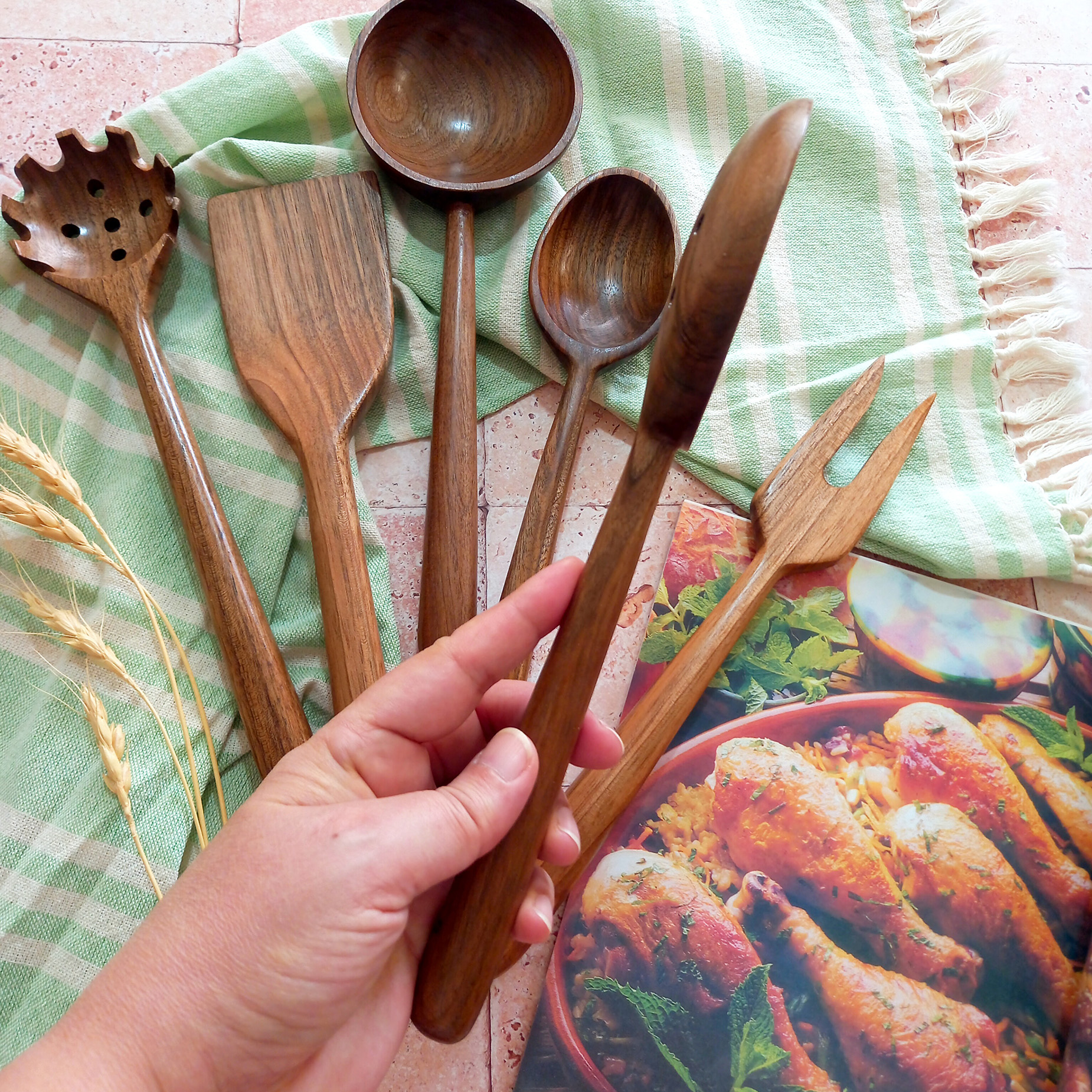 Handmade wooden spatula and ladle set, Barley Wood brand, Samin model, 6 pieces, walnut wood, 27 cm